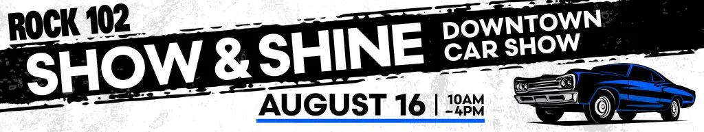 - Rock 102 Show & Shine Downtown Car Show runs Sunday, August 16 from 10:00 a.m. to 4:00 p.m.